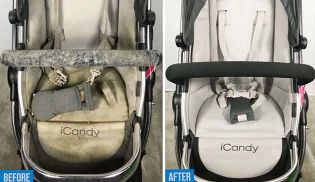 We always clean your baby buggy or other baby equipment to the best of our skills, and stains are removed as much as possible. But we cannot guarantee 100% removal of all stains. In the worst cases, we’ve had close to 100% removal rate.